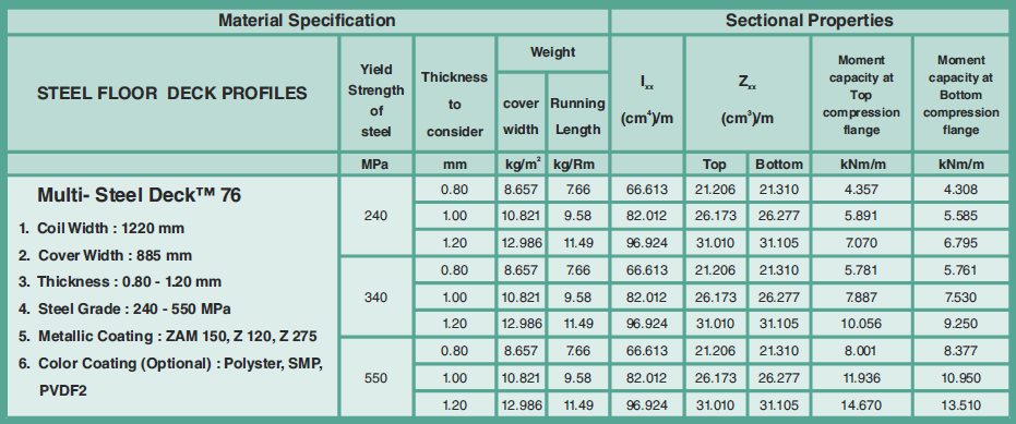 Multi Steel Floor Panel is produced from Galvanized steel Z275 (zinc 275gm/m²) and ZAM 150 (Zinc Aluminium Magnesium coated steel from Nisshin Steel, Japan) with the option of Color Coated Galvanized Steel produced in the thickness of 0.8mm, 1mm and 1.2mm. Available in steel grade 240 - 550 mpa