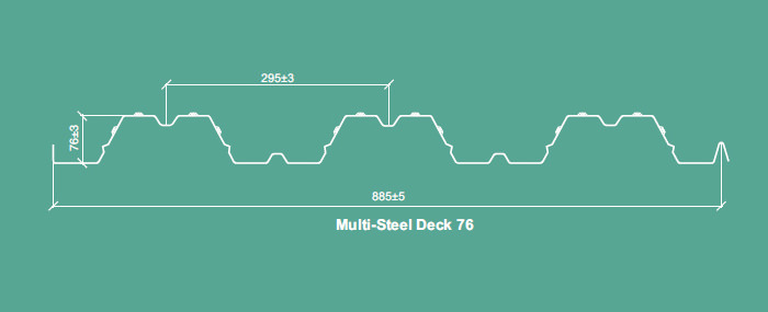 Multi Steel Floor Deck Panels; 76mm deep crest at 205mm distances having special embossment, rolled in to the profile created the highest bond between concrete and the steel floor, together with the smaller ribs and flutes enhances our product's composite action rigidity.