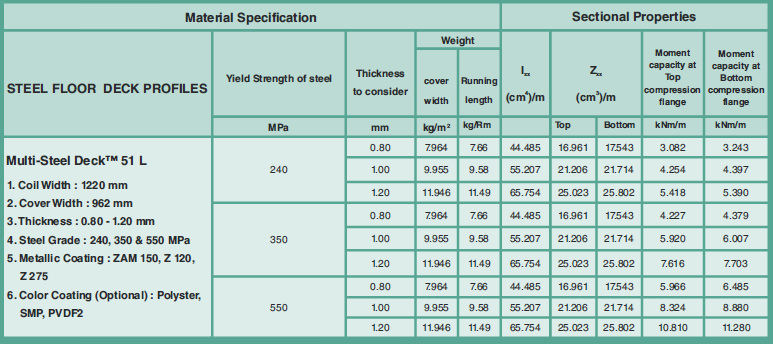 Multi Steel Floor Panel is produced from Galvanized steel Z275 (zinc 275gm/m2) and ZAM 150 (Zinc Aluminium Magnesium coated steel from Nisshin Steel, Japan) with the option of Color Coated Galvanized Steel produced in the thickness 0.8mm, 1mm and 1.2mm. Available in steel grade 240 - 550 mpa