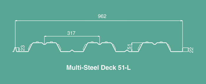 Multi Steel Floor Deck Panels; 51mm deep crest at 317mm distances having special embossment, rolled in to the profile created the highest bond between concrete and the steel floor, together with the smaller ribs and flutes enhances our product's composite action rigidity.